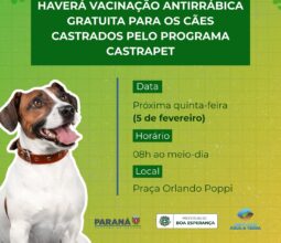 A Prefeitura de Boa Esperança informa aos tutores de cães que, como contrapartida do convênio firmado com o Governo do Estado do Paraná, por meio do Instituto Água e Terra…