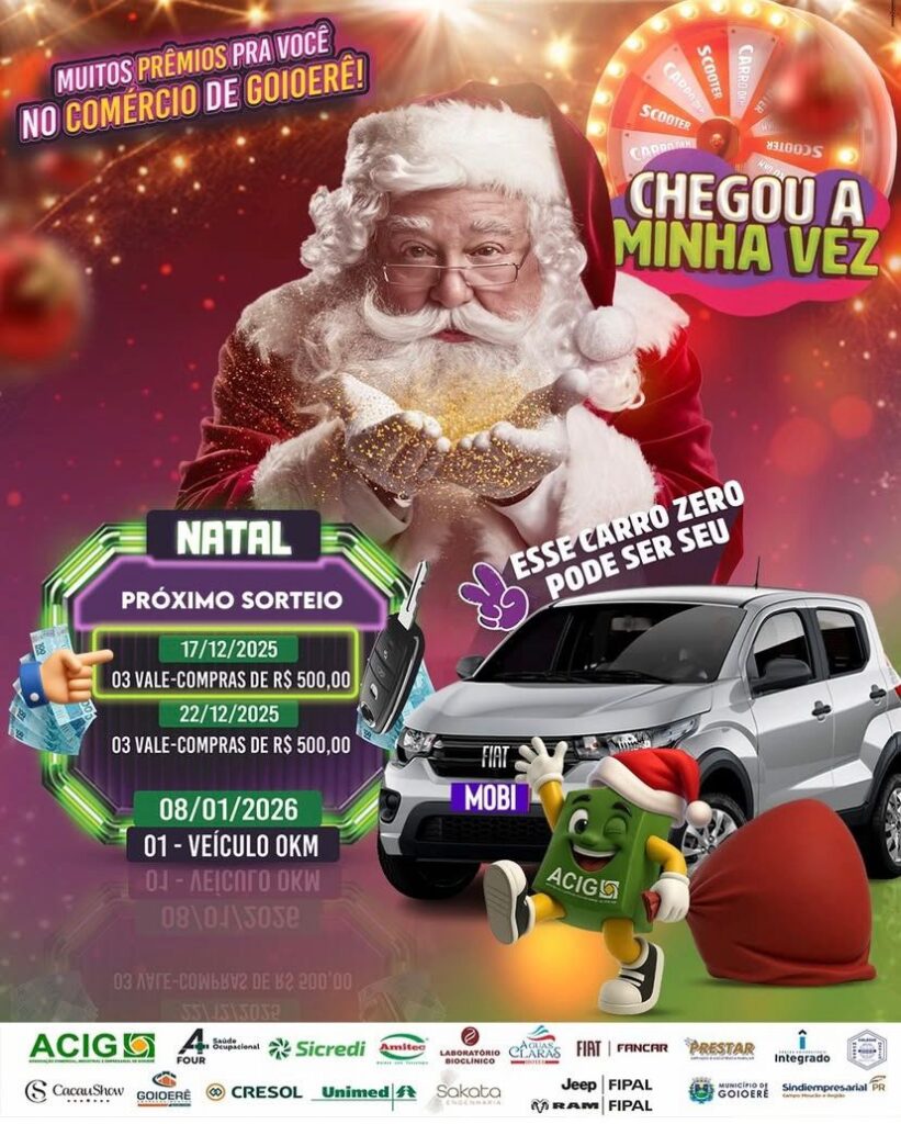 Nesta etapa da promoção, serão sorteados três vales-compras no valor de R$ 500 cada. Os sorteios seguem no dia 22 de dezembro, mais três vales-compras de R$ 500 e no dia 8 de janeiro de 2026, acontece o sorteio do prêmio mais aguardado da campanha: um Fiat Mobi 0 km.