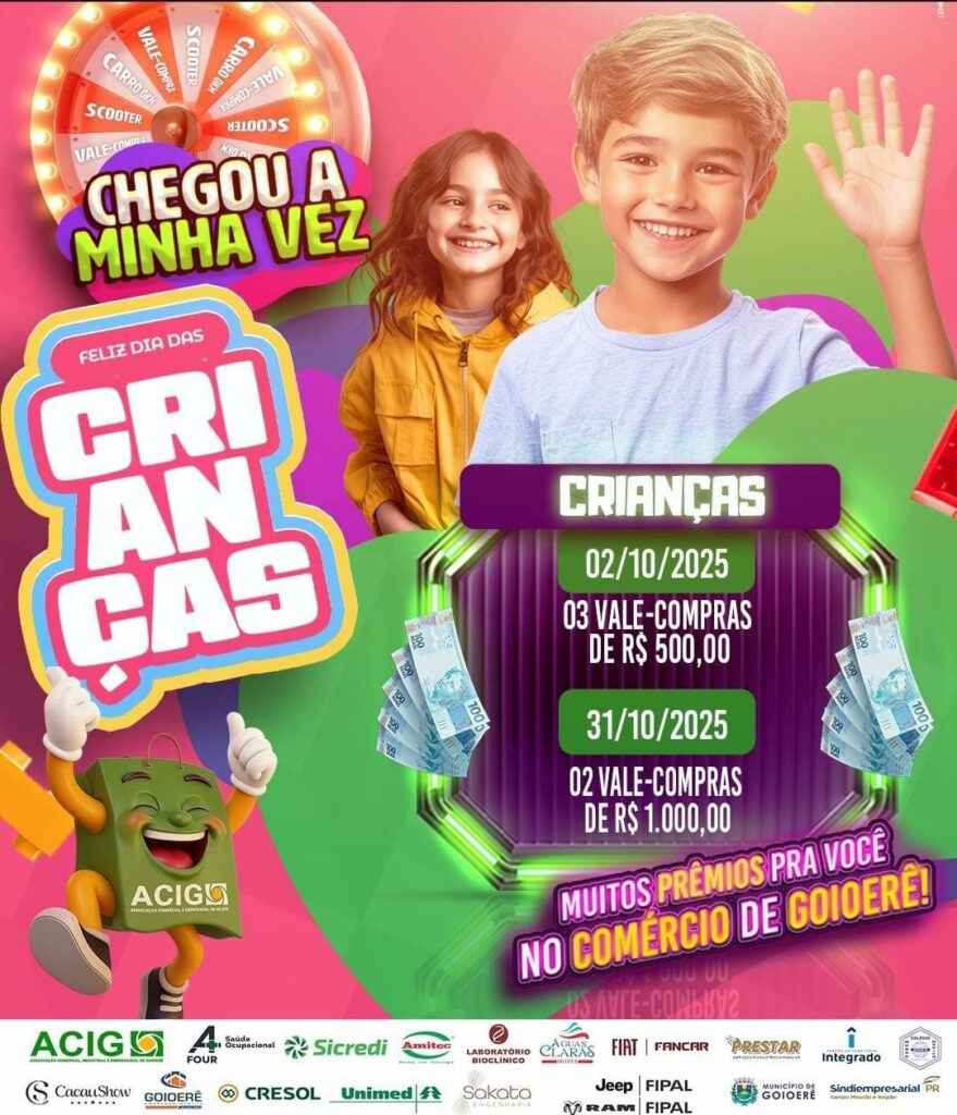 A Associação Comercial e Empresarial de Goioerê (Acig) realiza nesta quinta-feira (2), às 17 horas, o primeiro sorteio da campanha do Dia das Crianças. Serão distribuídos três vale-compras de R$ 500,00 cada.