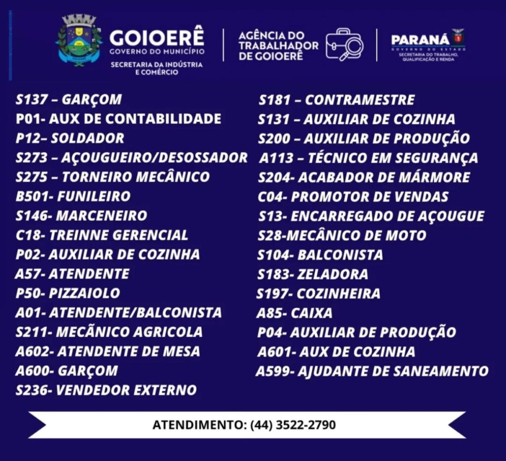 Os interessados devem procurar a Agência do Trabalhador de Goioerê, localizada junto à Secretaria de Indústria e Comércio, para obter mais informações sobre cada vaga e realizar o encaminhamento. O atendimento é feito pelo telefone (44) 3522-2790.