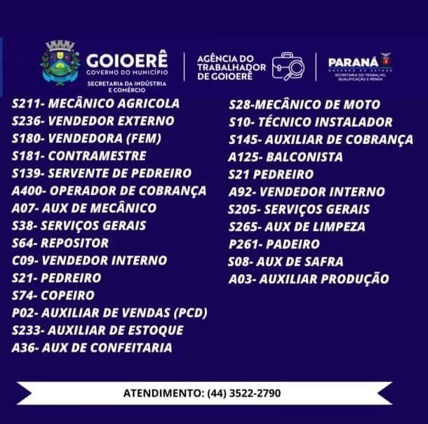 Os interessados devem procurar a Agência do Trabalhador de Goioerê, vinculada à Secretaria Municipal de Indústria e Comércio, para obter informações detalhadas sobre os requisitos de cada vaga, realizar encaminhamentos e manter o cadastro atualizado.