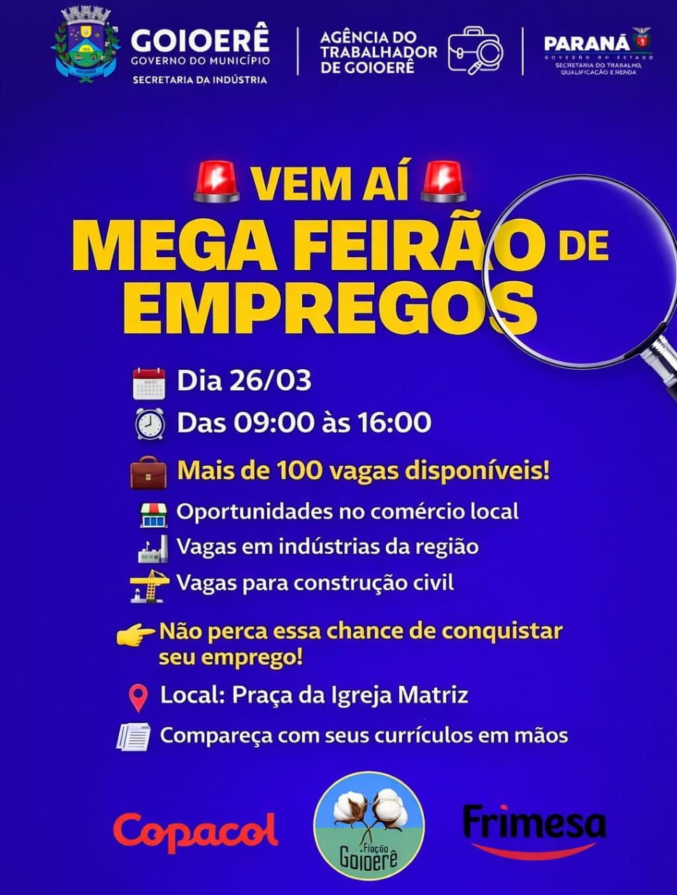 A Prefeitura de Goioerê, por meio da Agência do Trabalhador e da Secretaria de Indústria e Comércio, realiza no próximo dia 26 de março o Mega Feirão de Empregos, uma grande oportunidade para quem busca inserção ou recolocação no mercado de trabalho.