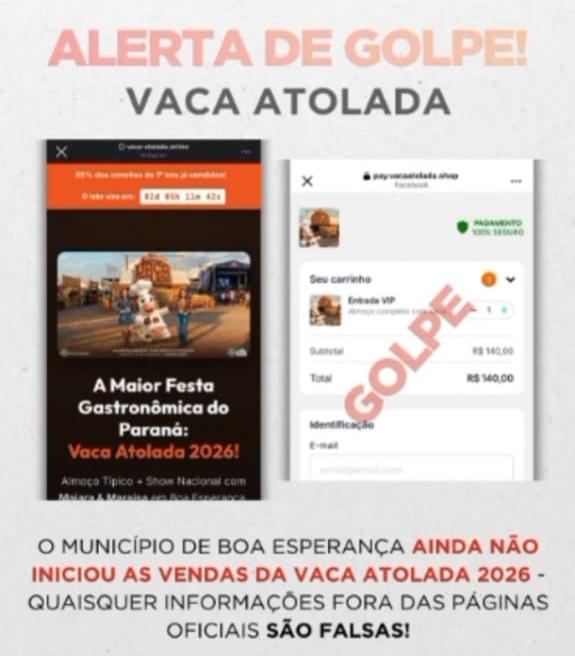 A Prefeitura de Boa Esperança emitiu um alerta à população após identificar a circulação de anúncios falsos relacionados à tradicional festa gastronômica “Vaca Atolada 2026”. De acordo com o município, criminosos estão utilizando páginas não oficiais para simular a venda de ingressos do evento, induzindo moradores e visitantes ao erro.