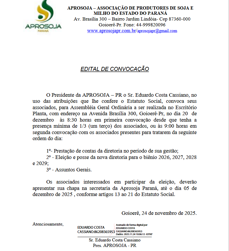 A APROSOJA-PR convocou seus associados para uma Assembleia Geral Ordinária no dia 20 de dezembro, no Escritório Planta, em Goioerê. Na pauta, estarão a prestação de contas da atual diretoria, a eleição e posse da nova gestão para o biênio 2026–2029 e a discussão de assuntos gerais de interesse da associação. Leia na integra clicando o Edital abaixo: