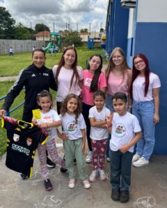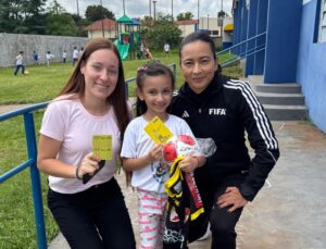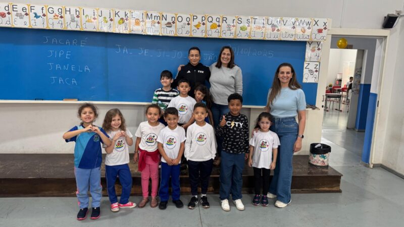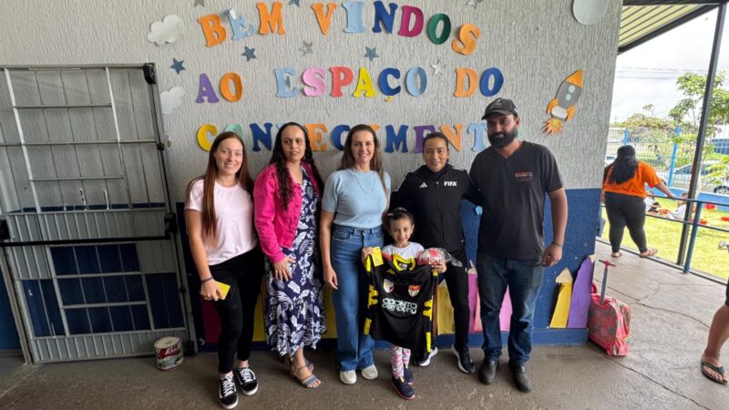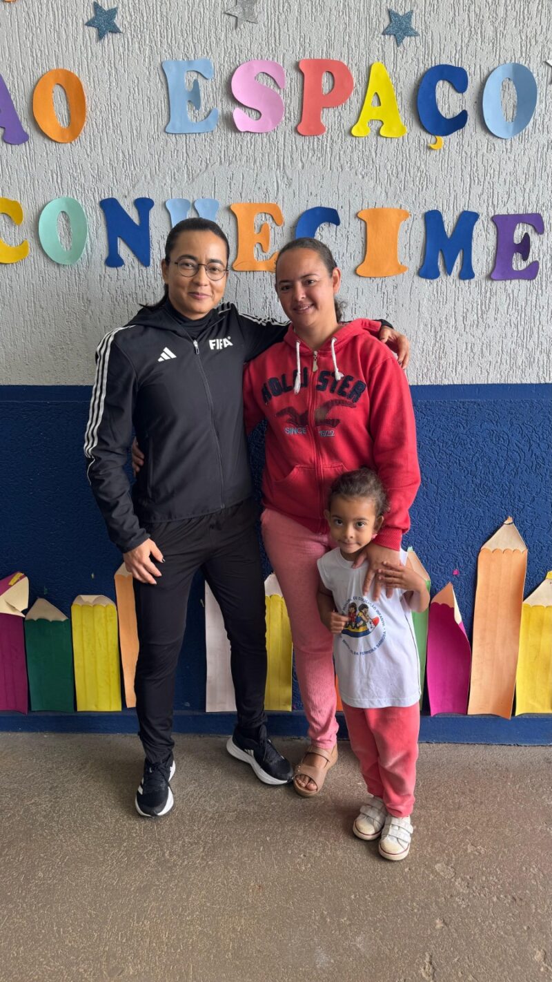 Edina presenteou a aluna e fez questão de expressar sua gratidão à diretora e à equipe do CMEI pela recepção calorosa. “Para mim é um orgulho ser homenageada na minha cidade dessa forma. Fico muito feliz com esses gestos — nada é mais gratificante que isso. Obrigada a todos que participaram da realização dessa homenagem”, declarou a árbitra.