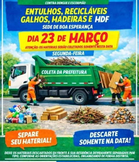 A Prefeitura de Boa Esperança realiza na próxima segunda-feira (23) mais uma ação de arrastão em Boa Esperança, com o objetivo de reforçar a limpeza urbana e prevenir doenças. A administração municipal alerta que a coleta acontecerá somente nesta data, sendo essencial que os moradores se organizem com antecedência. A orientação é separar corretamente os materiais e deixá-los em frente às residências, facilitando a atuação das equipes.