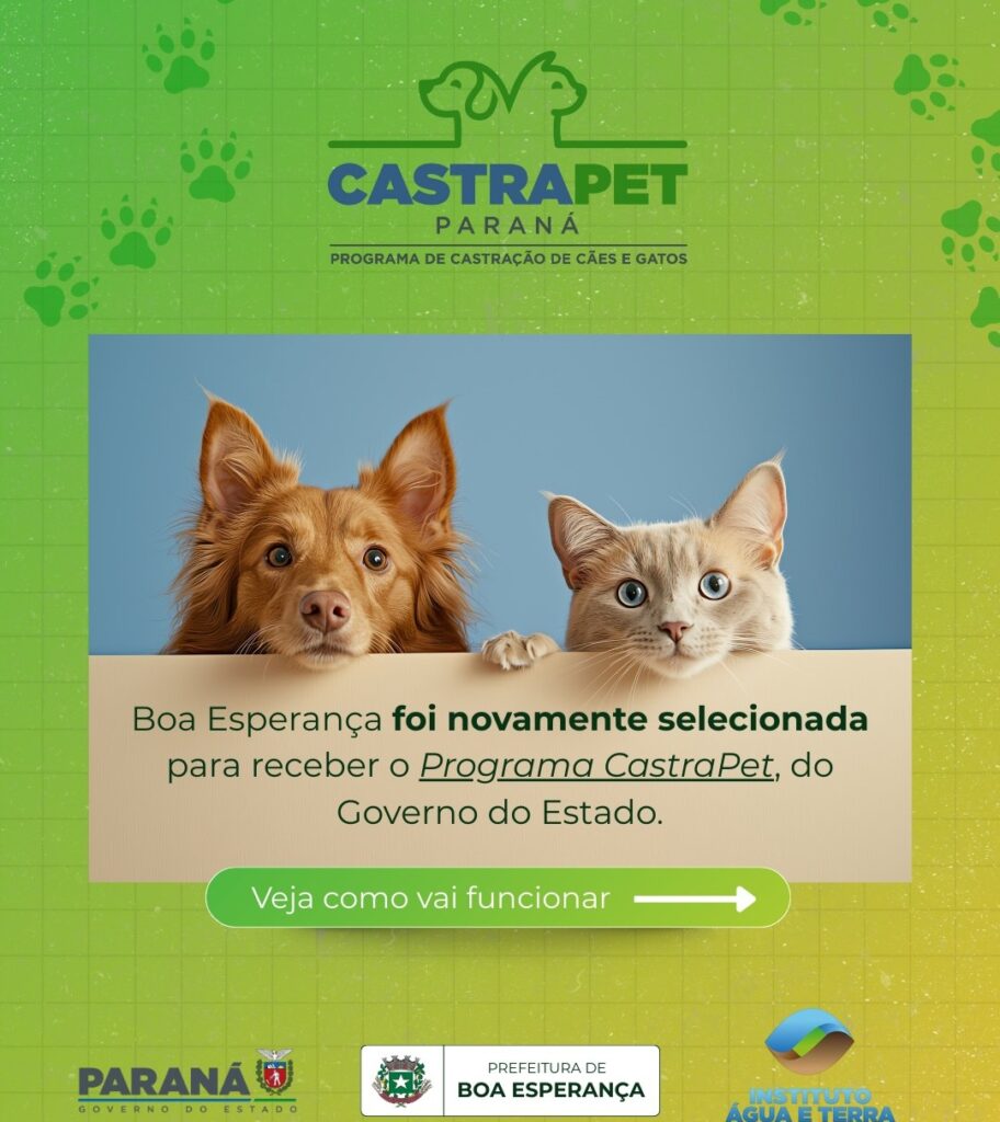 Boa Esperança foi contemplado mais uma vez pelo Programa CastraPet Paraná, iniciativa do Governo do Estado que oferece castração gratuita de cães e gatos. A ação, realizada em parceria com a Prefeitura, reforça o cuidado com a saúde animal e o bem-estar da comunidade.