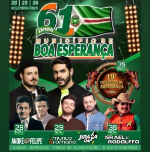 Falta apenas uma semana para que Boa Esperança viva um dos momentos mais aguardados do ano: a grande festa de comemoração pelos 61 anos do município. O prefeito Joel Buscariol definiu uma programação especial para as famílias do município e é aguardada a presença de um grande público da região. A programação consta co0m show, barracas, praça de alimentação e cavalgada.