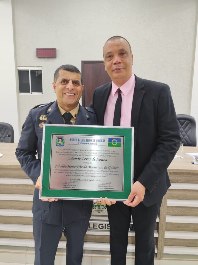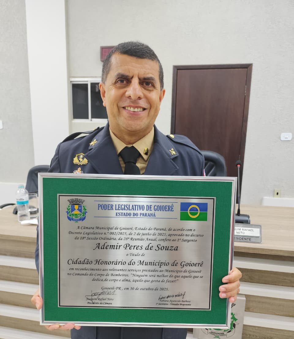A Câmara Municipal de Goioerê realizou, na noite de quinta-feira, 30, uma das solenidades mais prestigiadas dos últimos tempos, concedendo o Título de Cidadão Honorário ao 1º Sargento Ademir Peres de Souza, em reconhecimento à sua trajetória de dedicação, profissionalismo e relevantes serviços prestados à comunidade goioerense ao longo dos últimos 15 anos.