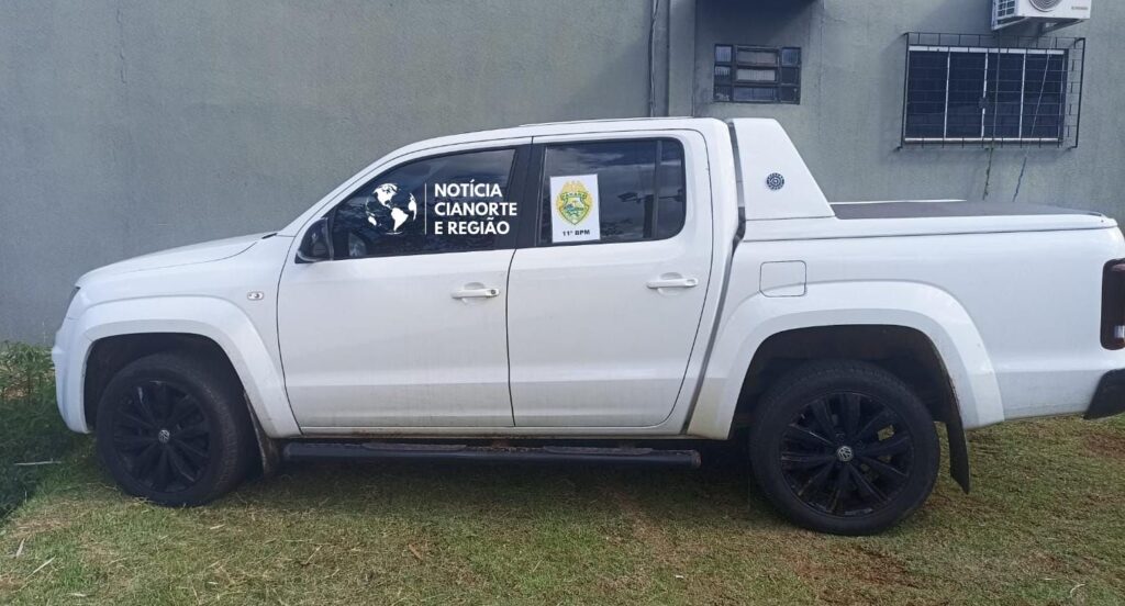 A ação teve início após denúncias de que um veículo branco estaria abandonado na região. Diante das informações, a equipe policial deslocou-se até o local indicado e, ao seguir marcas recentes de pneus em direção a uma área de mata, encontrou uma VW/Amarok branca escondida entre a vegetação.