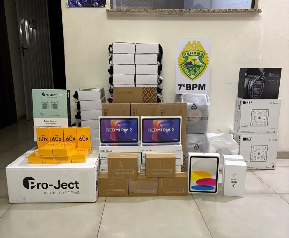 Uma operação rápida da Polícia Militar resultou na apreensão de uma grande quantidade de equipamentos eletrônicos e celulares de alto valor no início da noite de sexta-feira (13), em Goioerê. A ação foi desencadeada após denúncias de moradores do distrito de Bandeirantes do Oeste, em Formosa do Oeste, que relataram movimentação suspeita envolvendo o embarque apressado de volumes em um ônibus interestadual.