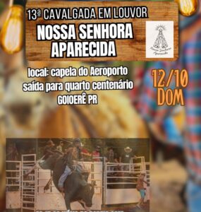 A comunidade do Bairro Aeroporto, em Goioerê, convida toda a população para participar da 13ª Cavalgada em Louvor a Nossa Senhora Aparecida, que acontece neste domingo (12), com uma programação especial.