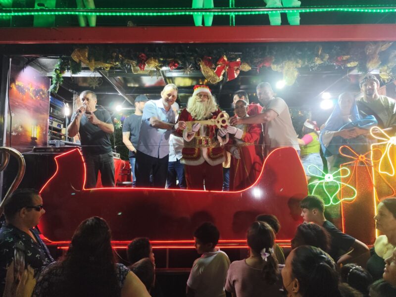 Ao chegar à Praça da Igreja Matriz, Papai Noel foi recebido com muita euforia e encantamento pelo público. Em um momento simbólico, recebeu das mãos do prefeito Pedro Coelho as chaves da cidade, oficializando a abertura das festividades natalinas. Na sequência, o Bom Velhinho seguiu para a Casa do Papai Noel, onde atendeu as crianças, tirou fotos e distribuiu carinho, tornando a noite ainda mais especial para os pequenos.