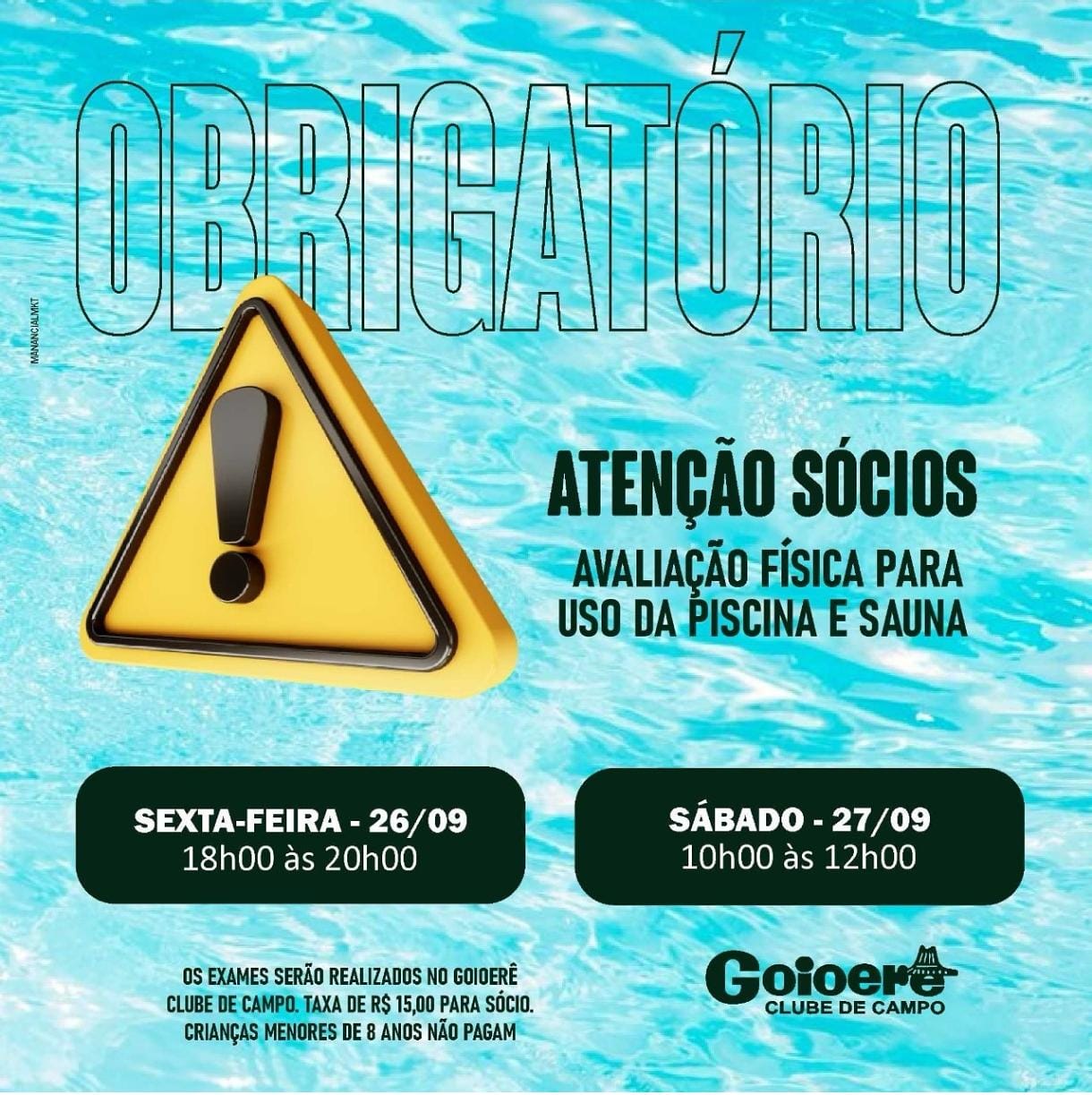 A diretoria destaca ainda que o uso da piscina e da sauna será permitido somente mediante a apresentação do exame de saúde. Para issso está acontcendo nos finais de semana os exames: esta sexta, 26, e sábado, 27, a agenda está aberta: