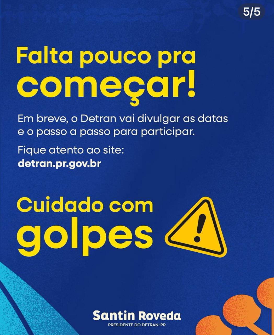 O Detran reforça um alerta importante: qualquer link, formulário ou promessa de cadastro antecipado é golpe. O órgão destaca que não há taxa, pagamento nem pré-inscrição e que todas as informações verdadeiras serão publicadas exclusivamente no site oficial: www.detran.pr.gov.br.