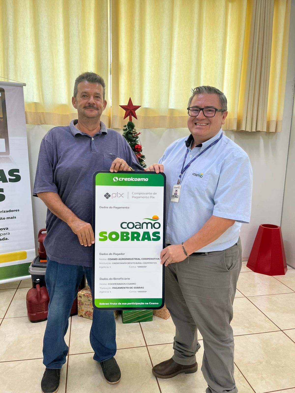 Cooperados de Rancho Alegre D’Oeste, Aparecido Antônio Polato e Valdenir Marques Viana:“Estamos muito felizes com o adiantamento das sobras. É um apoio importante neste período do ano.”