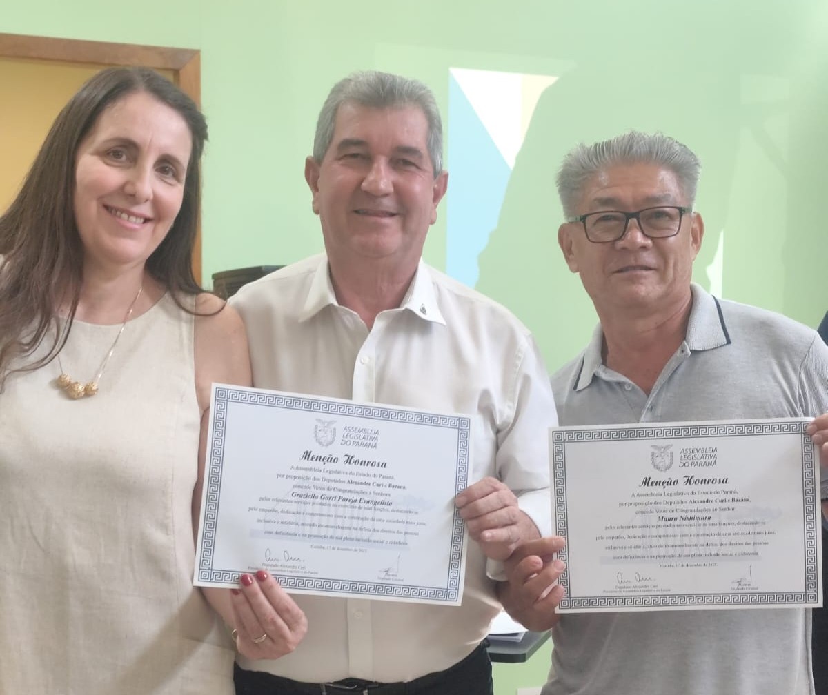 Durante o evento, o deputado estadual Pedro Paulo entregou uma placa de Moção Honrosa, concedida pela Assembleia Legislativa do Paraná por sua indicação, ao presidente da APAE, Mauro Nishimura, e à diretora Graziela Pareja.