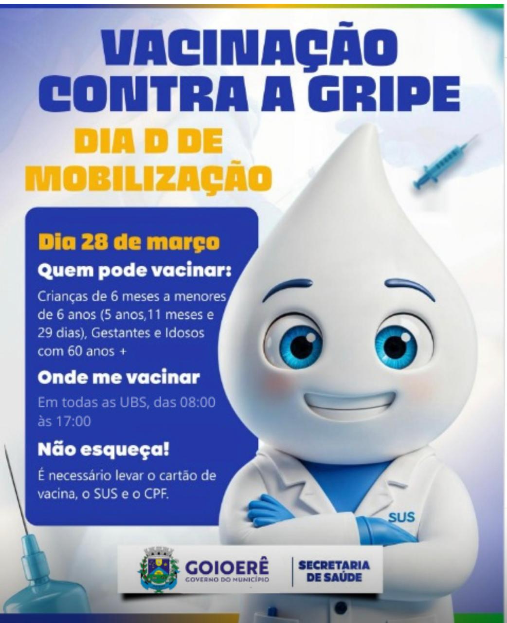 A Secretaria de Saúde, por meio da Atenção Primária e da Vigilância Epidemiológica, realiza no próximo sábado, 28 de março, o Dia D de Mobilização da Vacinação contra a gripe em Goioerê. A ação tem como objetivo ampliar a cobertura vacinal e proteger os grupos prioritários contra o vírus da influenza.