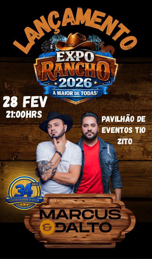 O lançamento contará com show da dupla Marcus & Dalto. O evento marca o início oficial das comemorações e reforça a tradição da ExpoRancho como um dos principais encontros culturais e festivos da região.