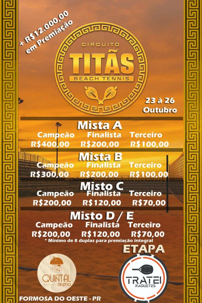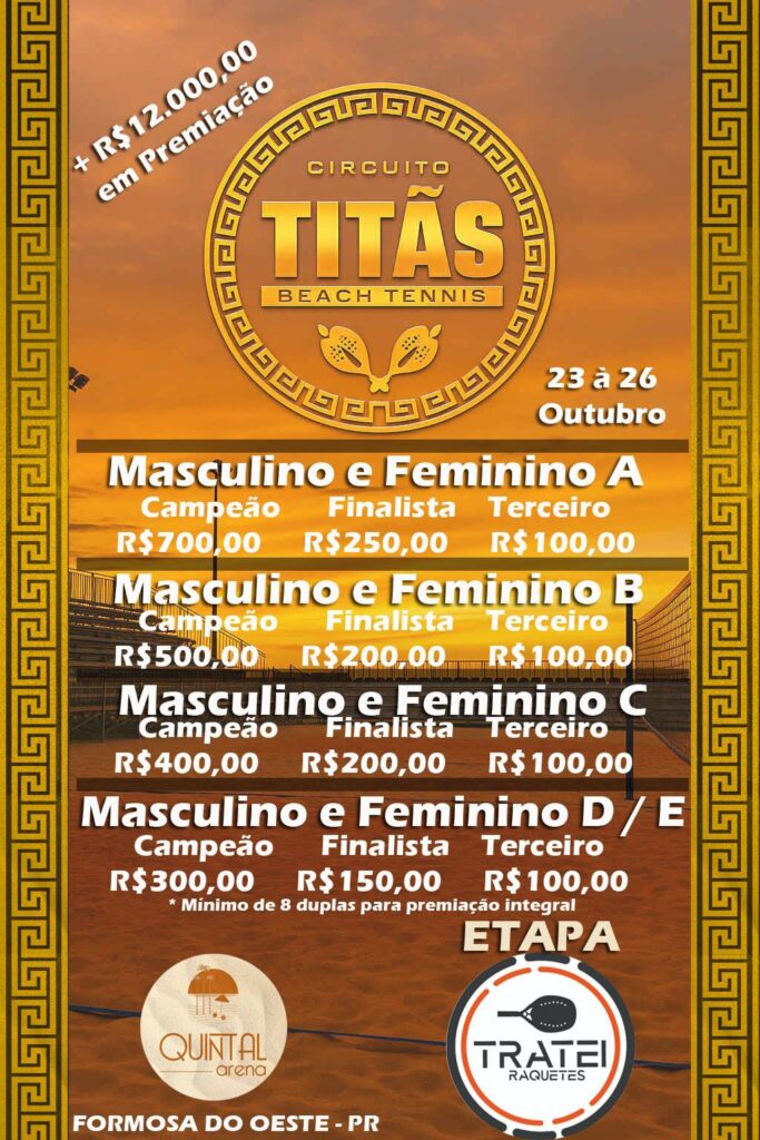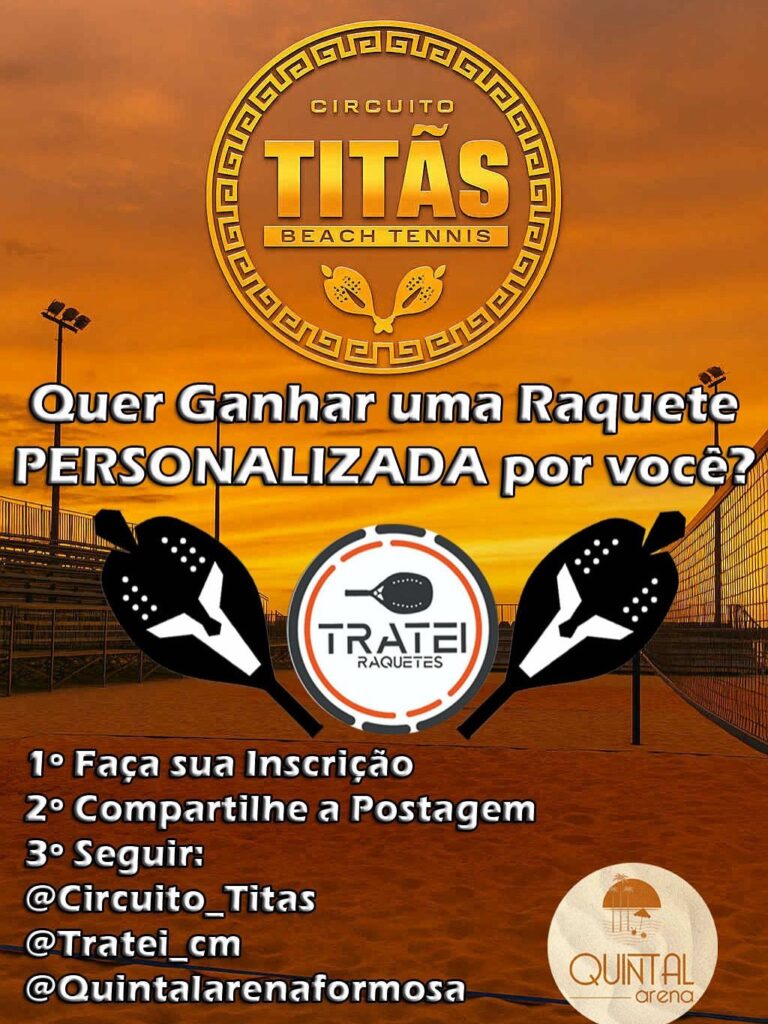 As inscrições seguem abertas e têm o valor de R$ 70,00 para a primeira categoria e R$ 30,00 para a segunda. O torneio é uma realização da equipe Titãs Beach Tennis, com apoio do Quintal Arena e da Tratei Raquetes, reunindo atletas de diferentes níveis técnicos e promovendo integração, esporte e lazer em um dos espaços mais completos da região. Premiação total: mais de R$ 12 mil entre as categorias Masculino e Feminino A, B, C, D e E.