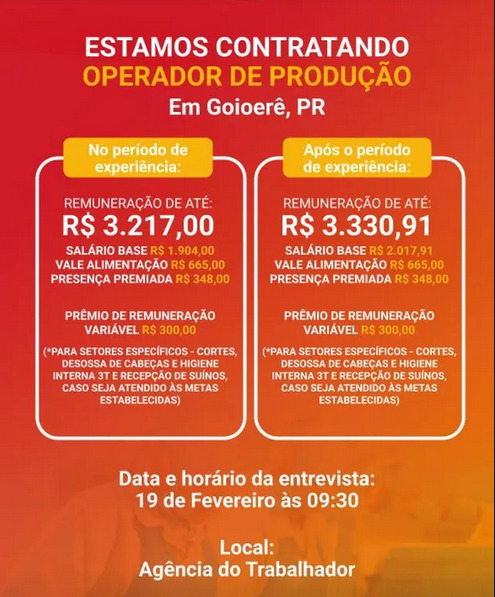 A Agência do Trabalhador de Goioerê anunciou nova oportunidade de emprego. A cooperativa Frimesa realizará entrevistas para a função de operador de produção nesta quinta-feira (19), às 9h30.