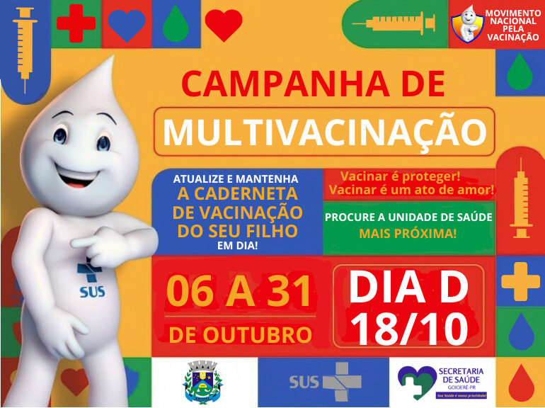A Secretaria Municipal de Saúde de Goioerê, inicia na próxima segunda-feira, dia 6 de outubro, a Campanha de Multivacinação 2025, que se estende até o dia 31. A ação tem como público-alvo crianças e adolescentes menores de 15 anos e tem como principal objetivo atualizar a caderneta de vacinas, reforçando a importância da imunização na prevenção de doenças.