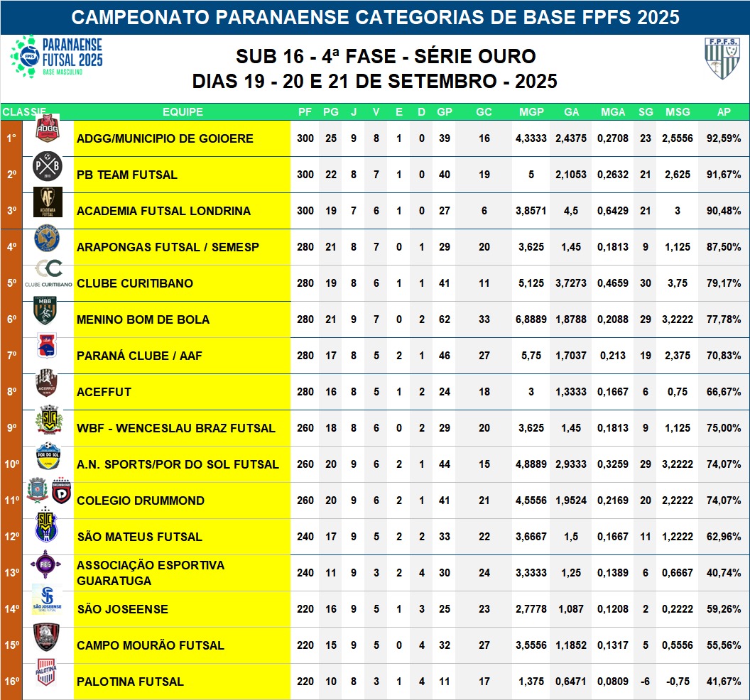 Goioerê lidera a classificação estadual e terá a ADGG /Goioerê representando a cidade. A equipe contará com a companhia do WBF – Wenceslau Braz Futsal, do Paraná Clube / AAF (Curitiba) e da Associação Esportiva Guaratuba – AEG (Guaratuba).