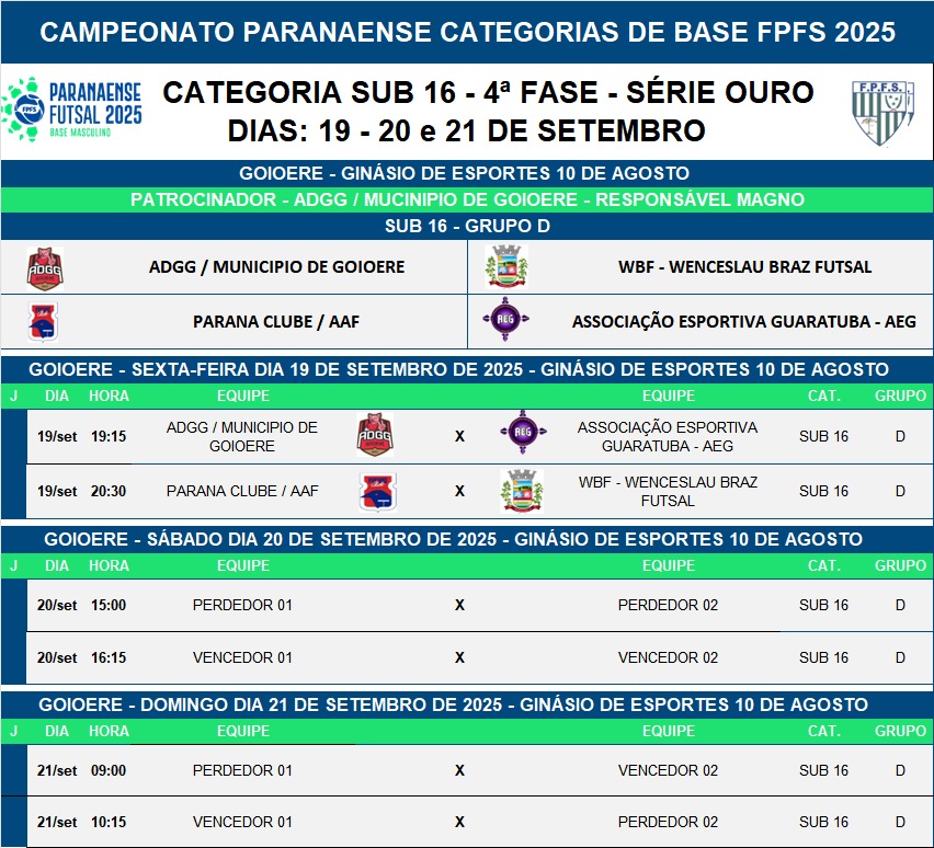O Ginásio de Esportes 10 de Agosto, em Goioerê, será palco, de sexta-feira, 19 a domingo 21, da 4ª fase do Campeonato Paranaense de Futsal 2025 – Sub-16, Série Ouro. A etapa reunirá quatro equipes do Grupo D, que disputarão seis partidas em busca da classificação para as próximas fases.