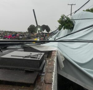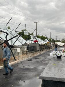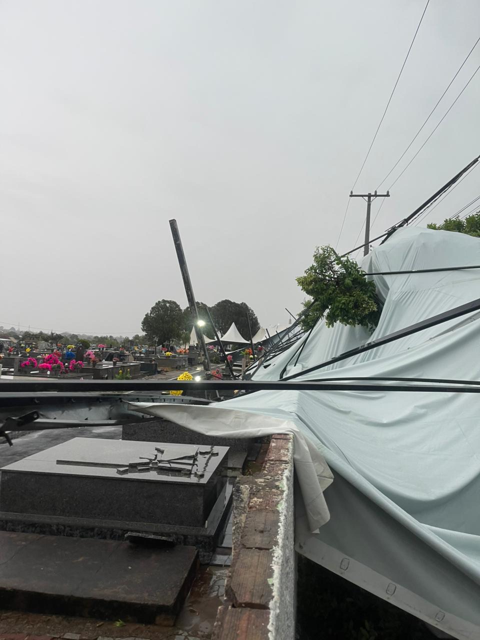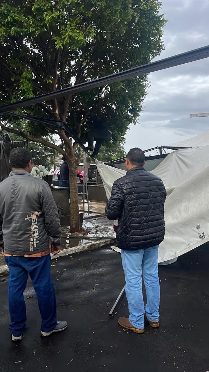O vento e a chuva causaram alguns danos nas tendas instaladas no cemitério municipal, mas as equipes agiram rapidamente e, ainda nas primeiras horas do dia, a situação já estava sendo normalizada, permitindo que o local ficasse novamente pronto para receber os visitantes.