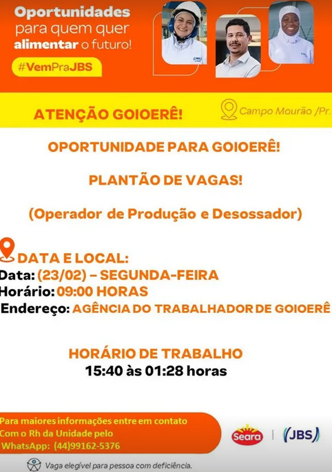 Notícias / Goioerê JBS realizará plantão de vagas na Agência do Trabalhador de Goioerê na próxima segunda