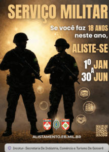 A Junta de Serviço Militar de Goioerê divulgou o início do período de Alistamento Militar Obrigatório para o ano de 2026. A convocação é direcionada a todos os cidadãos brasileiros do sexo masculino nascidos em 2008, que completarão 18 anos ao longo do próximo ano.