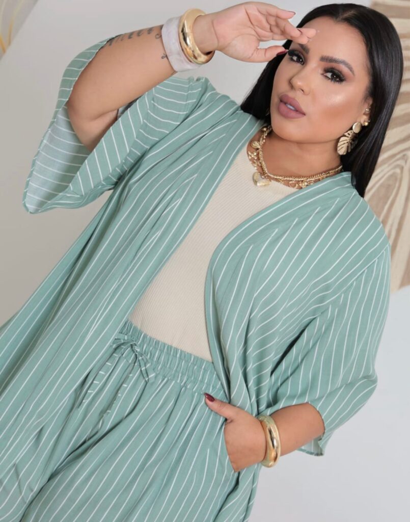 Outro destaque da coleção são os conjuntos de kimono Plus Size, que durante o Mês da Mulher estão com preço especial de R$ 90, reforçando o compromisso da loja em oferecer moda atual e acessível.