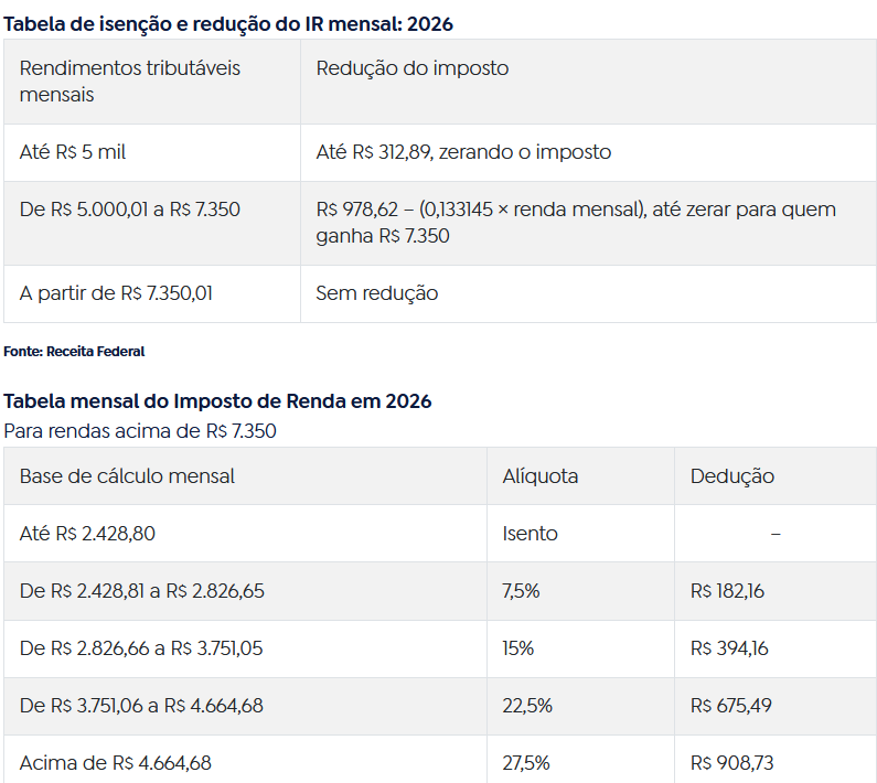 As alterações passam a valer para os salários pagos a partir de janeiro, com impacto percebido nos holerites de fevereiro. Os efeitos completos serão refletidos na Declaração do Imposto de Renda de 2027, referente aos rendimentos de 2026.