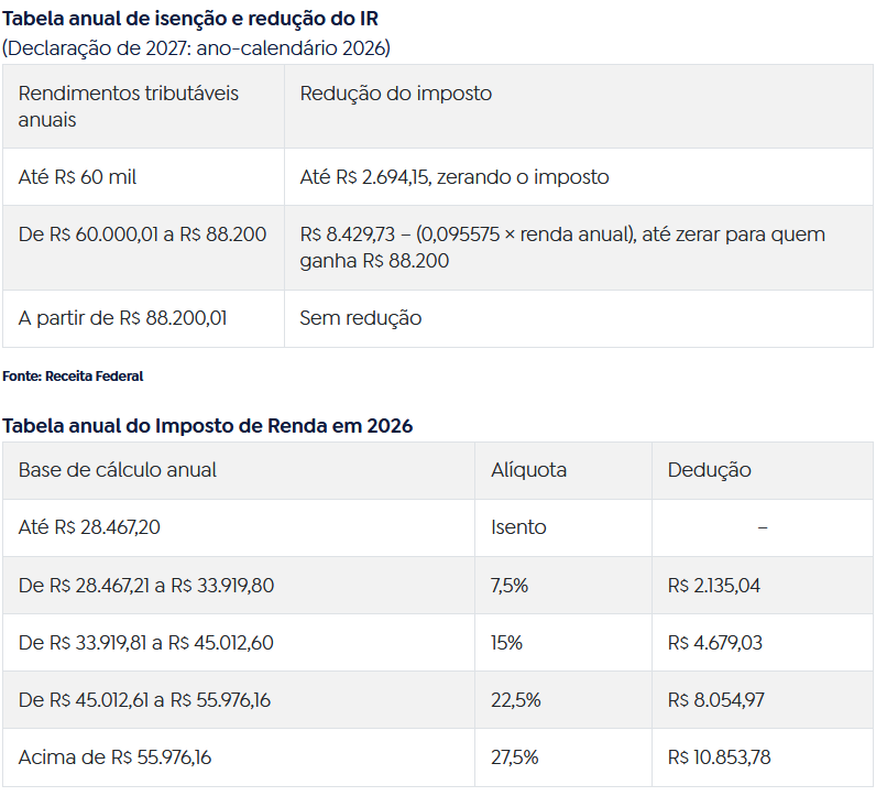 A tabela tradicional do Imposto de Renda permanece a mesma de 2025. A diferença está na criação de redutores adicionais, aplicados junto à tabela oficial, garantindo a isenção ou redução do imposto para faixas específicas de renda.