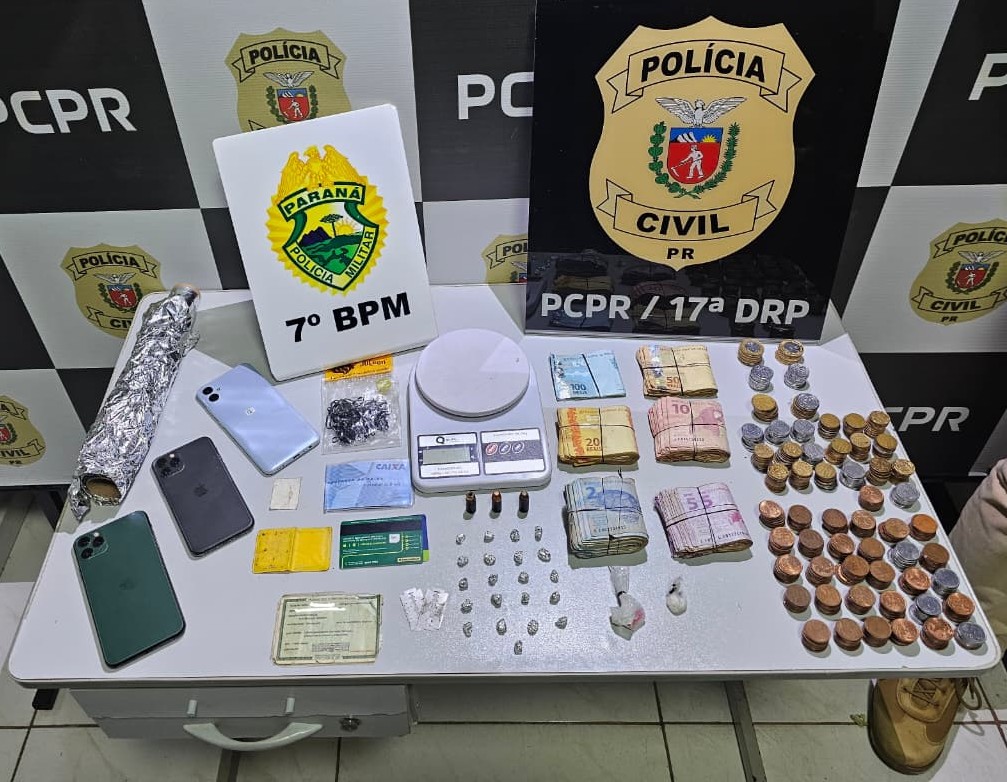 No interior do imóvel, foram apreendidas porções de crack e cocaína, além de uma balança de precisão e materiais utilizados no fracionamento das drogas, municições e dinheiro. Quatro pessoas — dois homens e duas mulheres — foram encaminhadas à Delegacia de Polícia Civil para os procedimentos cabíveis.