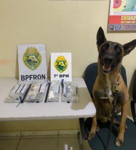 A partir da confirmação, as equipes deslocaram-se até a residência do suspeito, onde contaram com o apoio do BPFRON, reforço tático e do canil. O cão de faro indicou a cabeceira da cama, onde os policiais localizaram um saco plástico contendo 49 buchas de cocaína, totalizando 13,8 gramas.