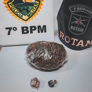 A abordagem ocorreu no trevo de acesso ao município, na Avenida Goiás. Durante a revista pessoal, os policiais localizaram uma porção de substância análoga à maconha do tipo “capulho”, pesando aproximadamente 71 gramas, além de cerca de 5 gramas de haxixe. Também foram apreendidos um aparelho celular e documentos pessoais.