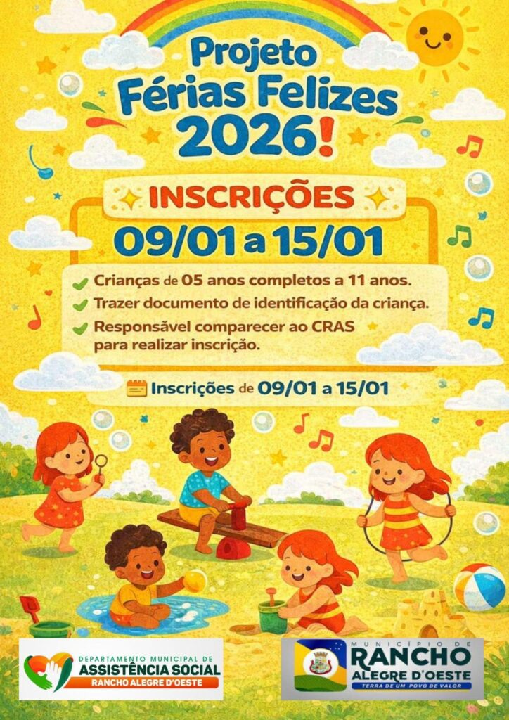 A Prefeitura de Rancho Alegre d’Oeste abriu as inscrições para o Projeto Férias Felizes 2026, que promete mais um ano de momentos de lazer e diversão para as crianças do município durante o período de férias escolares.