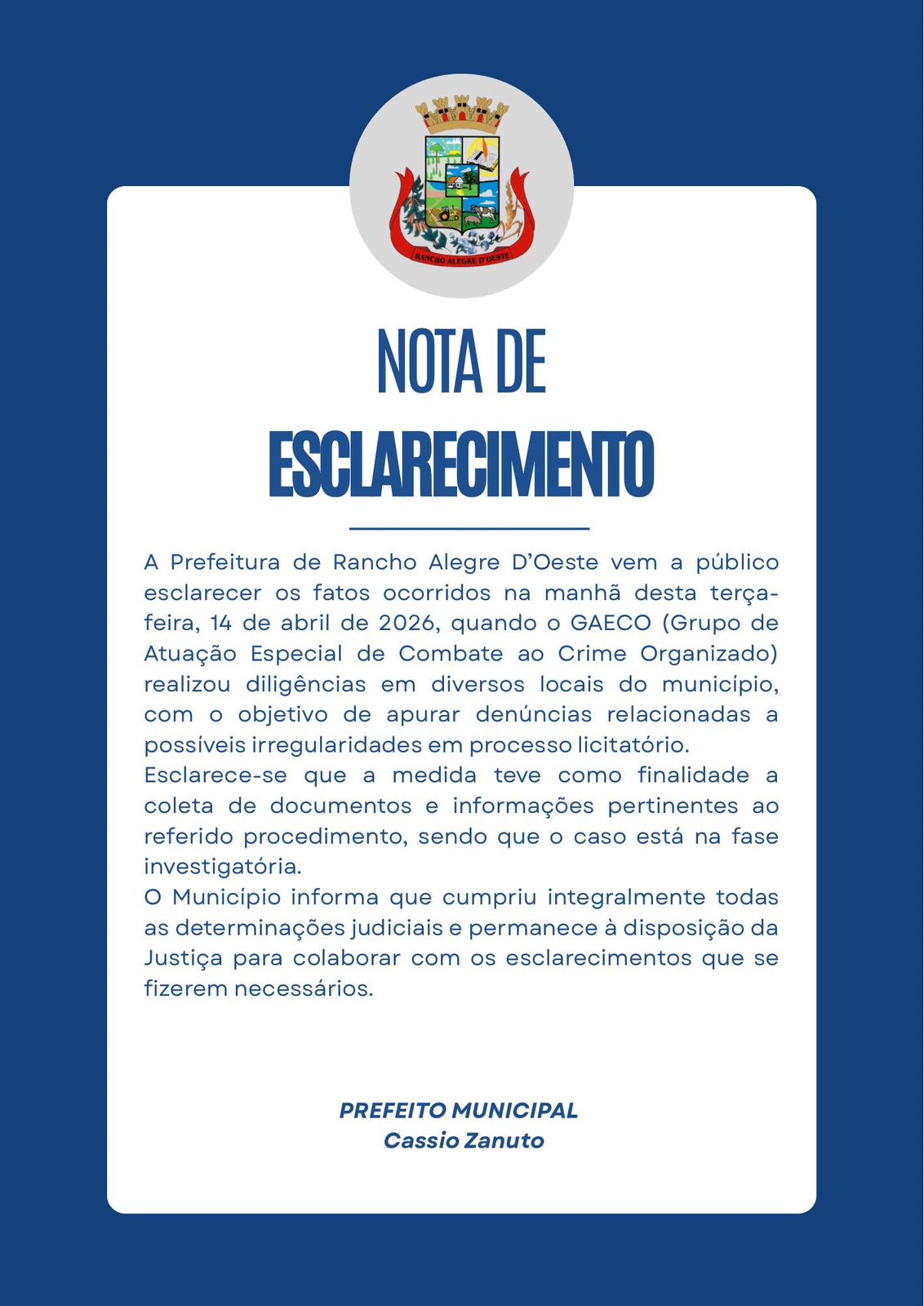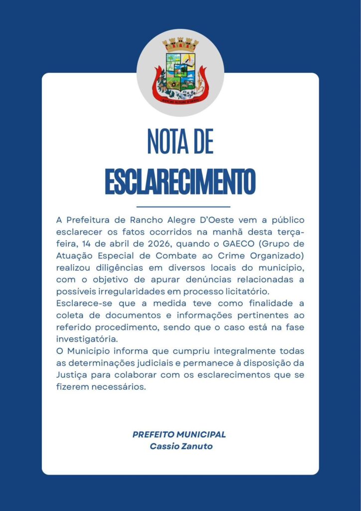 A Prefeitura de Rancho Alegre D’Oeste emitiu Nota de Esclarecimento sobre a operação realizada na manhã desta terça-feira (14), quando o Grupo de Atuação Especial de Combate ao Crime Organizado (Gaeco), ligado ao Ministério Público do Paraná, cumpriu mandados de busca e apreensão no município.