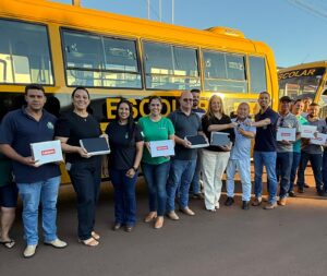 A Prefeitura de Quarto Centenário realizou nesta segunda-feira (22) a entrega de dois ônibus escolares 0 km, avaliados em R$ 824 mil, e 226 tablets, no valor de R$ 265,6 mil. No total, foram investidos R$ 1.089.663,60, custeados integralmente com recursos próprios do município.