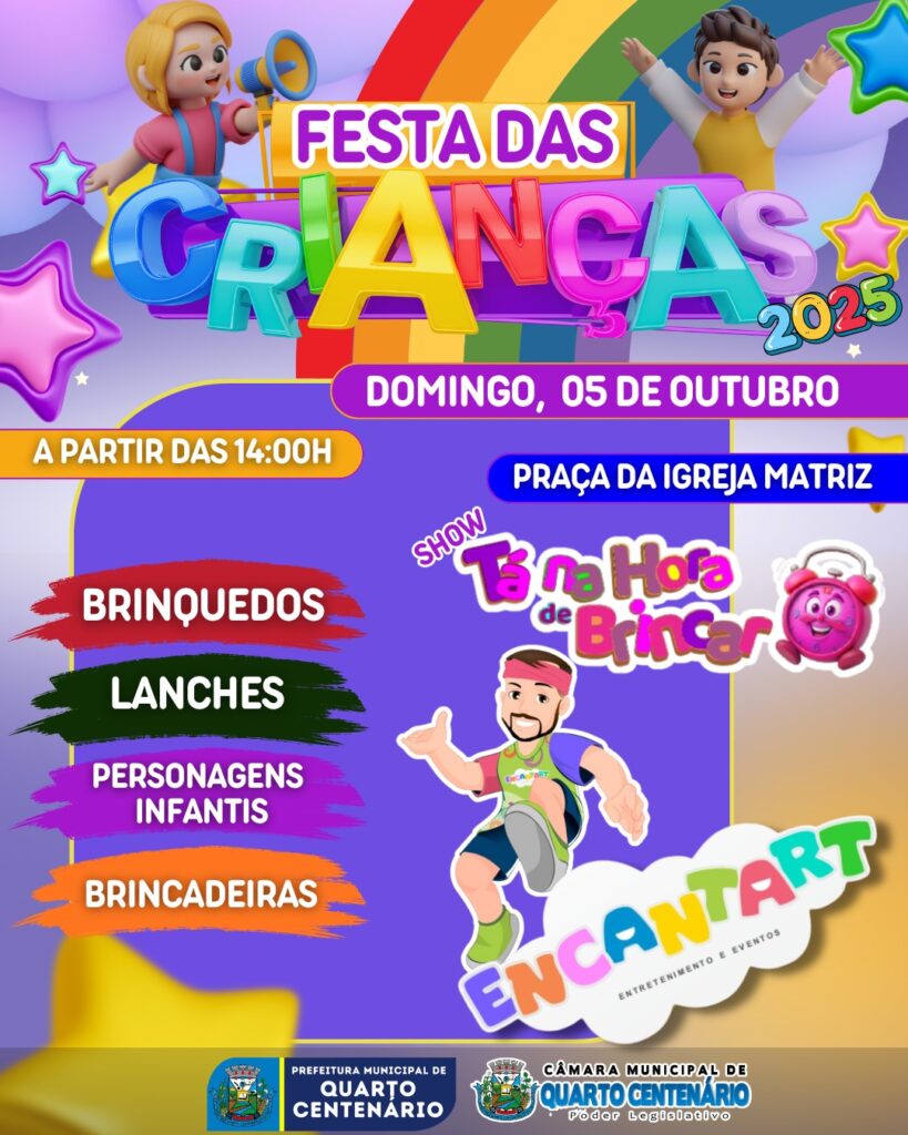 A Prefeitura de Quarto Centenário promove neste domingo, 5 de outubro, a Festa das Crianças, um evento preparado especialmente para celebrar a data com muita alegria e diversão. A programação terá início às 14h, na área central da cidade, e é aberta a toda a população.