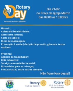 A Praça da Igreja Matriz será palco, neste sábado (21), de uma grande ação de cidadania promovida pelo Rotary Club de Goioerê. Das 9h às 13h, acontece o Rotary Day, evento que reúne parceiros, voluntários e órgãos públicos com o objetivo de aproximar serviços essenciais da população.