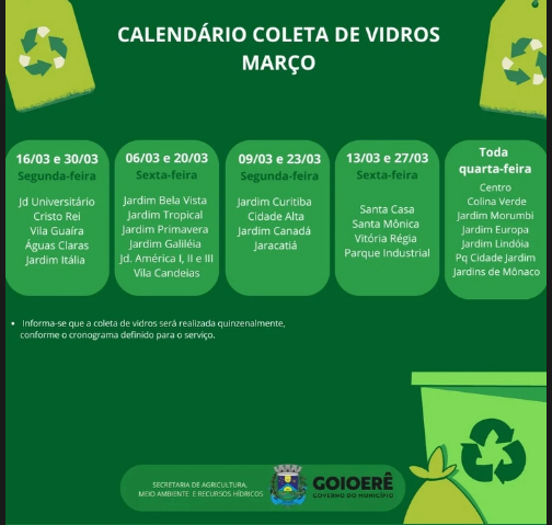 A Secretaria de Agricultura e Meio Ambiente de Goioerê está divulgando o calendário de coleta de vidros nos bairros do município, iniciativa que tem como objetivo incentivar o descarte correto desse tipo de material e fortalecer as ações de preservação ambiental.