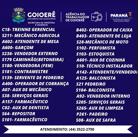 Os interessados em qualquer uma das vagas devem procurar a Agência do Trabalhador de Goioerê, junto à Secretaria de Indústria e Comércio, ou entrar em contato pelo telefone (44) 3522-2790 para mais informações.