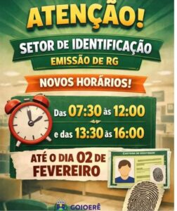 A Secretaria de Indústria e Comércio de Goioerê divulgou comunicado à população informando a alteração temporária no horário de funcionamento do Setor de Identificação, responsável pela emissão da Carteira de Identidade (RG), que funciona anexo à Secretaria.