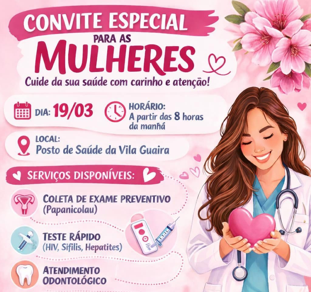 A Secretaria Municipal de Saúde promoverá, na próxima semana, dia 19, a partir das 8 horas da manhã, uma ação especial dedicada à saúde da mulher no Posto de Saúde da Vila Guaíra. A iniciativa busca incentivar o cuidado, a prevenção e o acompanhamento da saúde feminina, aproximando ainda mais os serviços de saúde da comunidade.