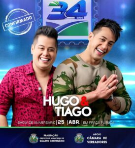 A Prefeitura de Quarto Centenário anunciou a dupla Hugo & Tiago como uma das principais atrações das festividades dos 34 anos do município. A apresentação integra a agenda especial organizada pela Administração Municipal.
