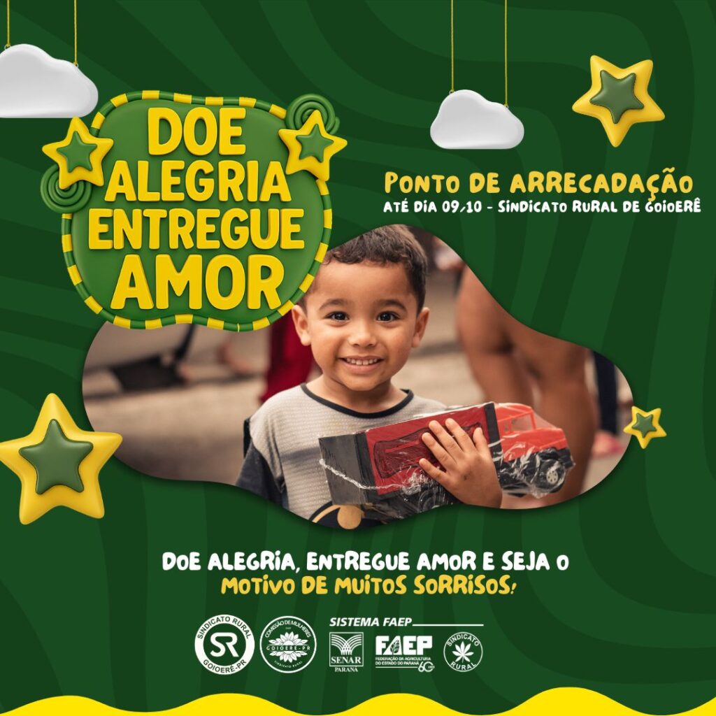 O Sindicato Rural de Goioerê, em parceria com a Comissão de Mulheres, lançou nesta semana a campanha Doe Alegria, Entregue Amor”, voltada para a arrecadação de brinquedos novos que serão entregues a crianças em situação de vulnerabilidade no Dia das Crianças.