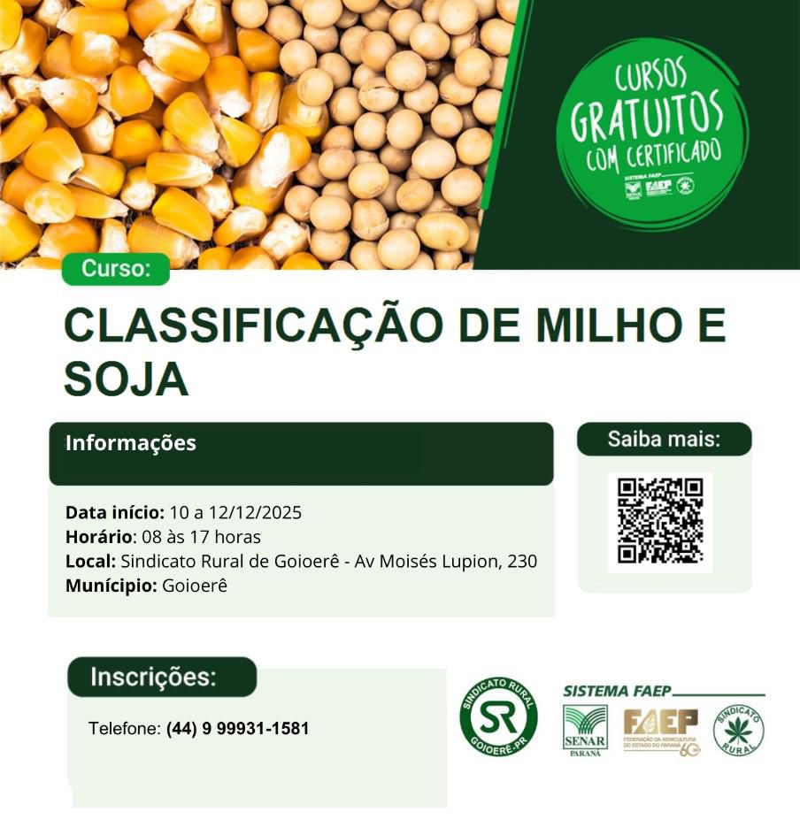 O Sindicato Rural de Goioerê inicia nesta quarta-feira, 12 o Curso de Classificação de Grãos – Milho e Soja, para quem deseja ampliar conhecimentos, conquistar novas habilidades e se preparar ainda mais para as demandas do mercado do agronegócio. Ainda restam algumas vagasmmpara o curso.