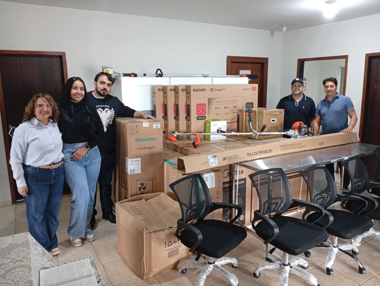Entre os itens entregues estão quatro televisores LED de 50 polegadas, três geladeiras de 473 litros, oito cadeiras de escritório, dois freezers horizontais, um aparelho de ar-condicionado de 60 mil BTUs, um moto podador de galhos e um projetor multimídia Full HD.